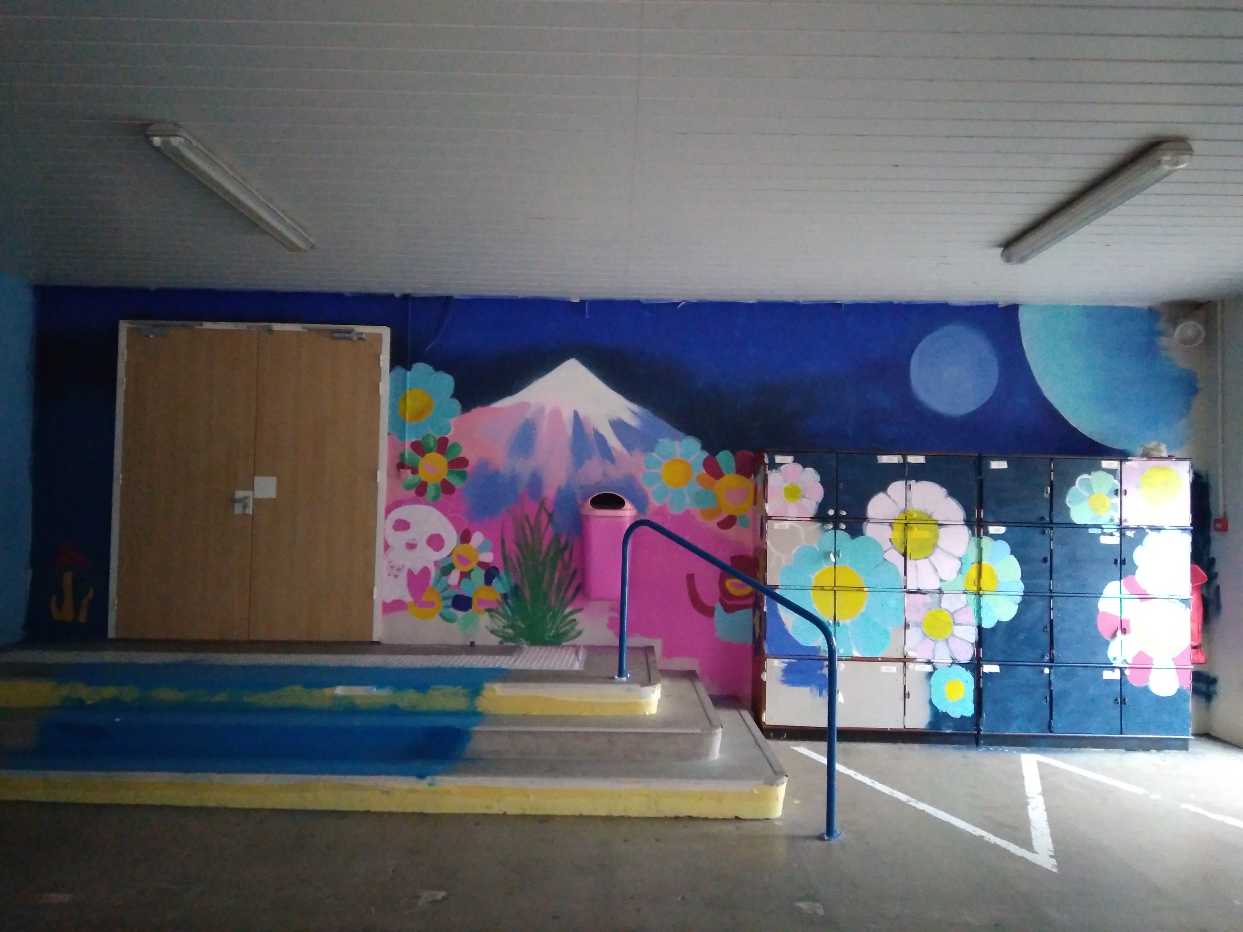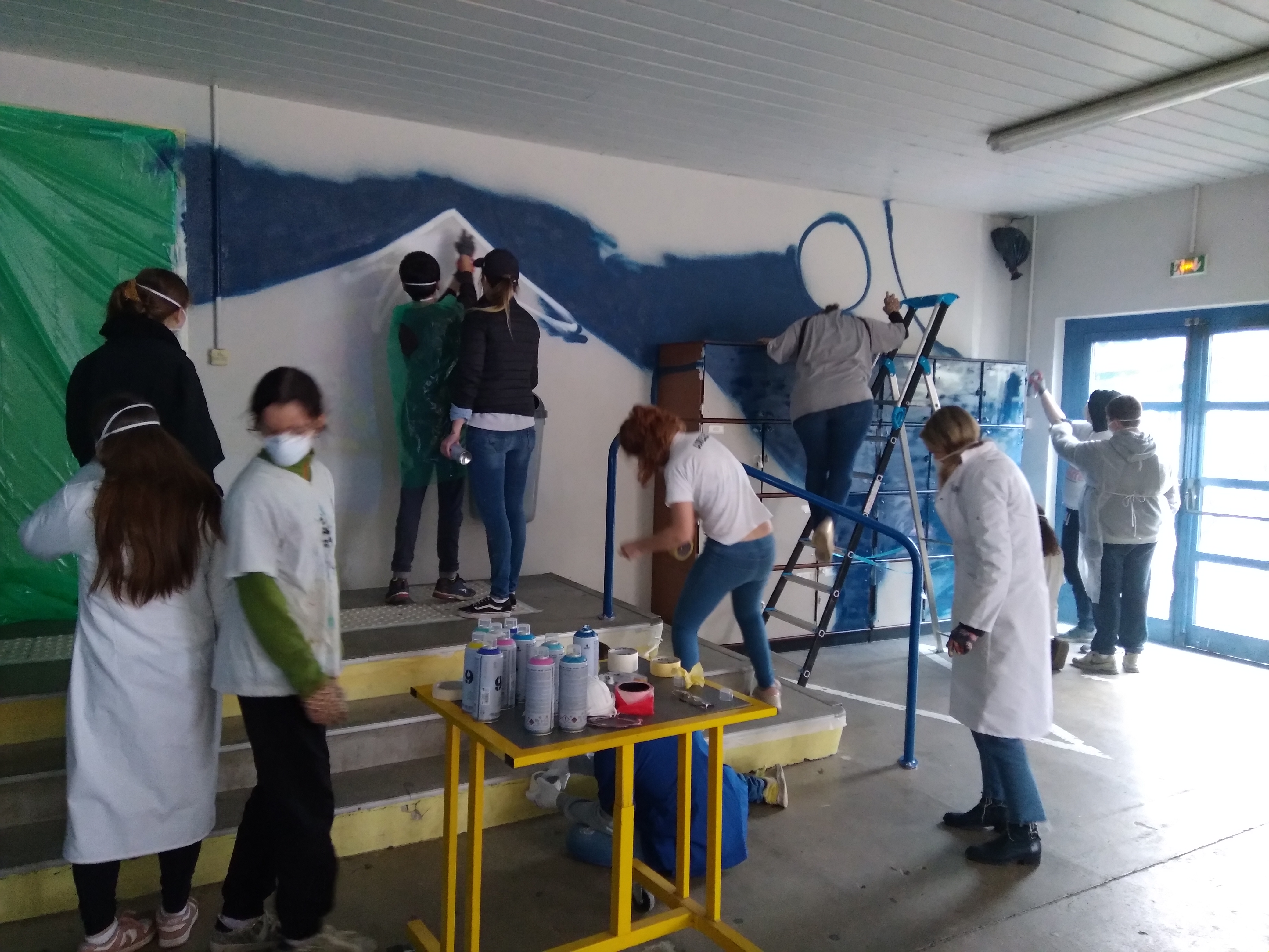 Réalisation d’une fresque sous le préau, en collaboration avec une artiste locale, Sophie Revel, les 12 élèves du dispositif ULIS, mesdames Falco et Trotzier de mars à mai. Nous avons dans un premier temps travaillé au CDI (2 sessions de 2h): madame Revel a commencé par un cours sur l’histoire des graffitis, les artistes emblématiques du Street art. Les élèves ont ensuite sélectionné des livres, magasines, BD pour chercher des images. Ils ont dessiné les premiers croquis du projet. Madame Falco avait en amont de l’intervention de l’artiste travaillé sur le thème de la nature avec eux. À partir de leurs envies nous avons orienté le projet sur le Japon, les mangas, la culture pop, les dessins animés et personnages de jeux.