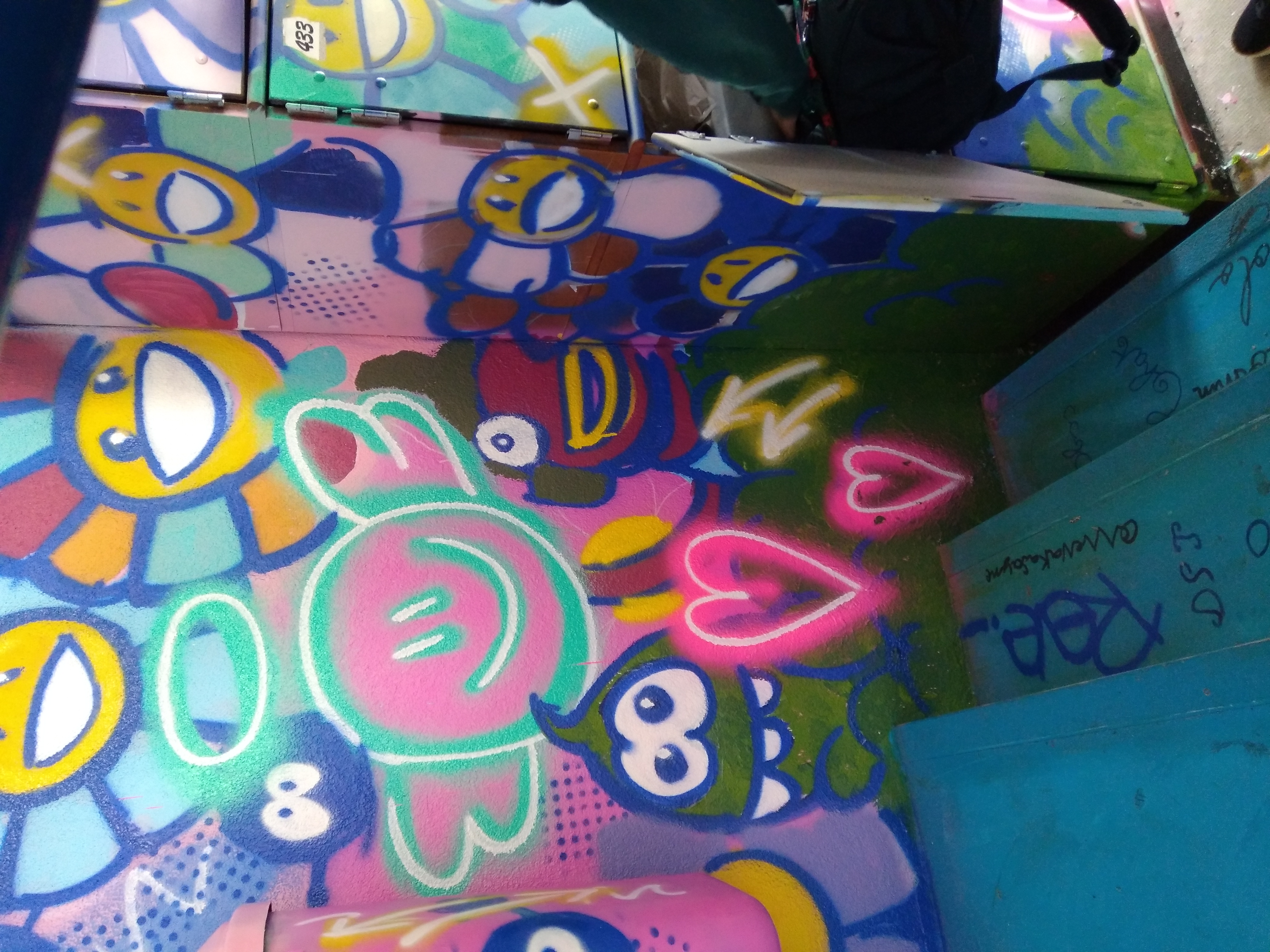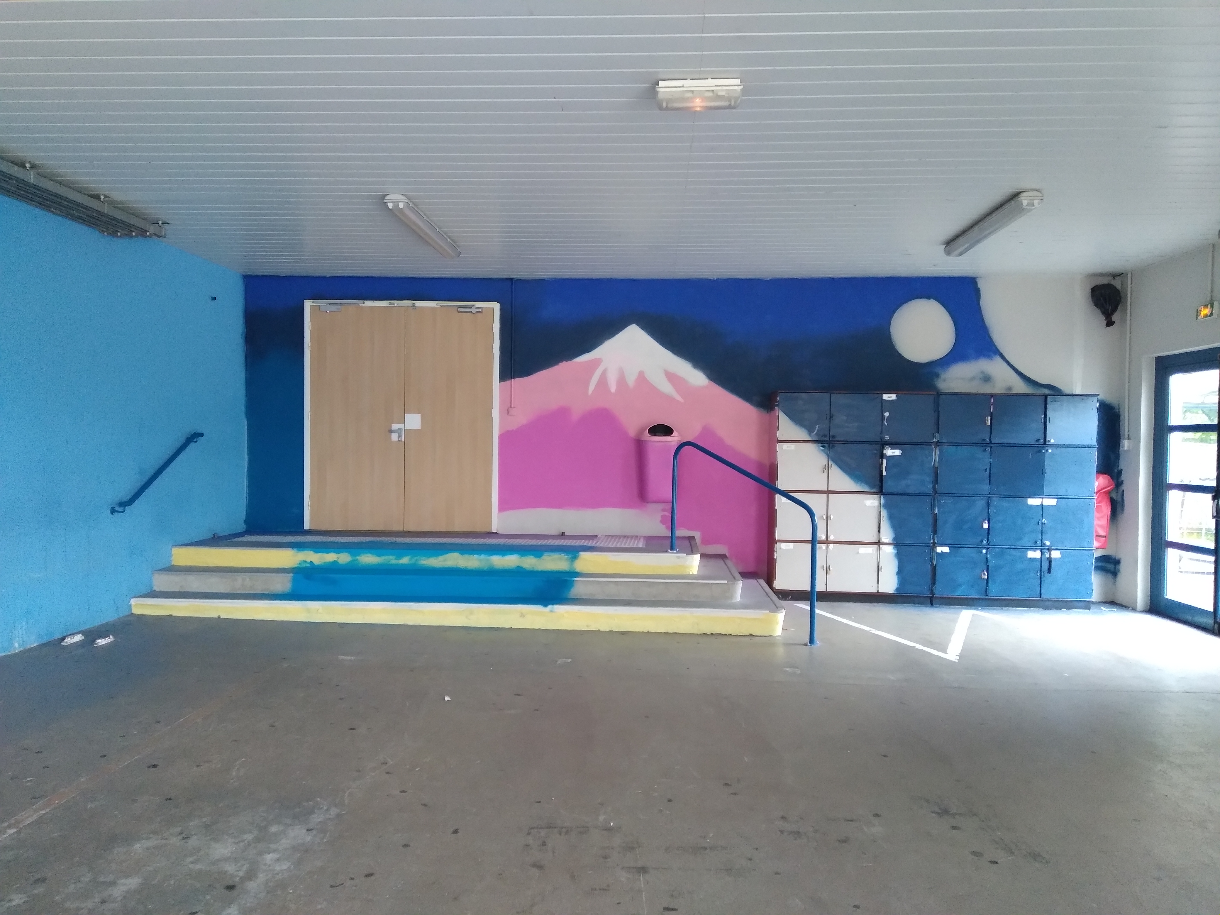 À partir des croquis des élèves l’artiste a fait plusieurs propositions. Nous avons ensuite préparé le préau (masquage) et initié les élèves à l’utilisation des bombes aérosol. L’artiste a projeté le projet au mur à l’aide d’un vidéo projecteur. Les élèves ont pu reproduire leurs dessins et commencé à peindre. Nous avons fait 3 sessions de 2h avec les élèves mais avons travaillé avant et après pour avancer le projet et travailler en hauteur.