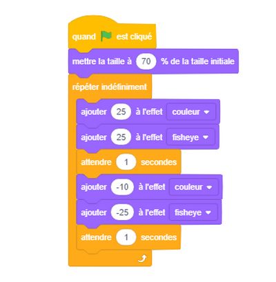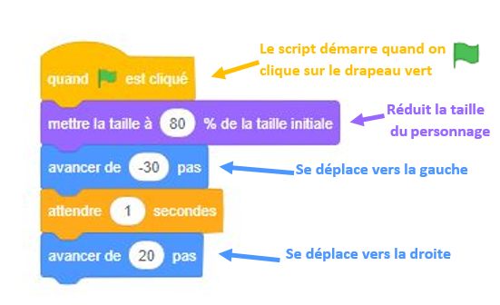 3°/ Modifie les nombres dans les blocs avancer pour modifier le déplacement Répète ces 3 étapes pour faire se déplacer d'autres personnages