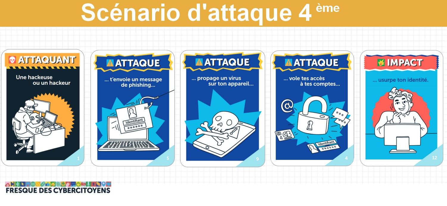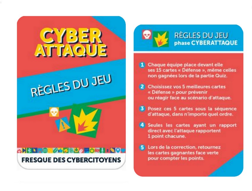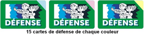 Distribuer à chaque équipe le scénario d'attaque (voir ci-dessous) Distribuer à chaque équipe une série de 15 cartes défense (chaque série a une couleur différente : Bleu, rose, jaune ). Jeu : Chaque équipe sélectionne les cartes de défense qui correspondent à l'attaque et les place en dessous de la carte d'attaque qui correspond.