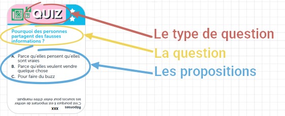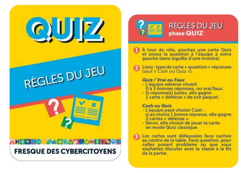 Préparation : Créer 3 équipes de 2 à 4 joueurs par jeu Placer au centre de la table 20 cartes quiz sélectionnées au préalable (20 cartes = 20 minutes) . Jeu : À tour de rôle, chaque équipe va piocher une carte « Quiz » et lire la question à l’équipe à sa gauche en indiquant le type de question, la question et les propositions (sauf pour les cartes « Cash ou Quiz »). Après concertation, l'équipe interrogée donne sa réponse. Si l’équipe répond correctement ( en indiquant toute les bonnes réponses) à une carte « Quiz » ou « Vrai ou Faux », elle gagne 1 carte Défense tirée du paquet de son équipe. Pour une carte Cash ou quiz, si l’équipe choisit l'option Cash et donne au moins une réponse juste, elle gagne 2 cartes Défense. L’équipe qui a posé la question lit les bonnes réponses et le texte explicatif. Fin de la phase de quiz : Lorsque il n'y a plus de cartes quizz au centre de la table, chaque équipe compte le nombre de cartes Défense gagnées. |