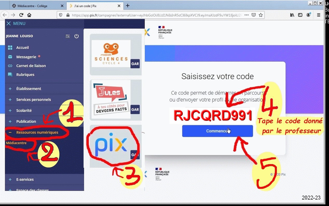 1-Connecte-toi à l'ENT du collège et fais les étapes 1 à 5 de l'image de droit.